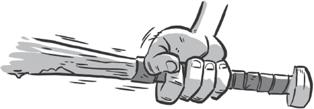I slam the bat into the creature’s thick cranium until he roars – a sound like BLARG!!! – and his palm opens and –