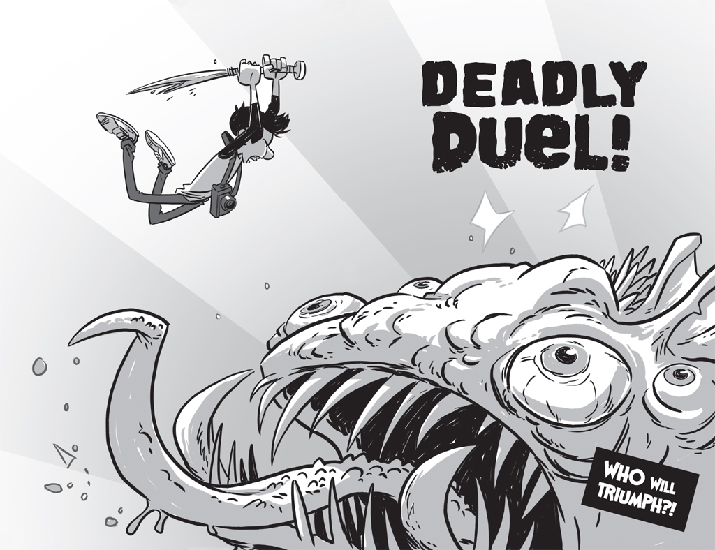 With a spine-tingling moan, the beast’s mouth opens wide, revealing an army of dirty fangs, with chunks of flesh between each tooth. I kick. I squirm. And, facing imminent death-by-devouring, I at last BITE. My teeth sink into monster flesh and his paw loosens slightly – just enough for me to wrap my fingers around my blade’s handle, rip it free, and –