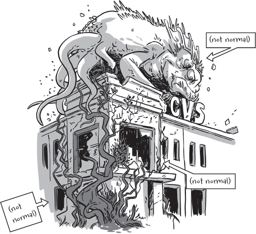 One of the monster’s giant feet fills, like, the entire store. One toe in the school supplies aisle, another on top of the hairspray and deodorant aisle. Dashing up and over the monster’s foot, toward the front of the store, I spot what I came for . . .