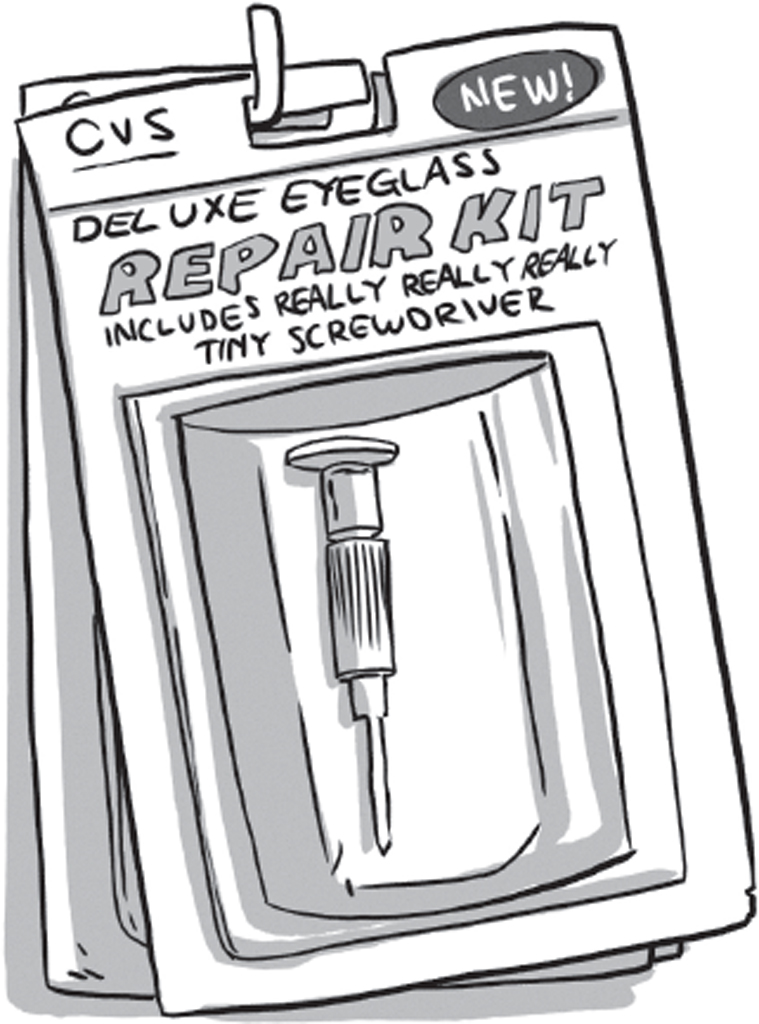 I’m at CVS because I need an eyeglass repair kit – those little tool sets that dads buy for when their glasses break. I know, that’s a lame thing to need. But I have a walkie and that walkie is busted and to fix that walkie, I need a really really really tiny screwdriver and the only place to get a really really really tiny screwdriver is in an eyeglass repair kit.