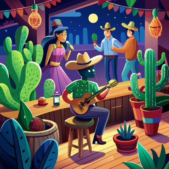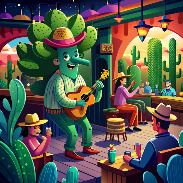 In the heart of Texas, nestled between the dusty streets and the starry skies, there stood a lively local bar known as the «Saguaro Saloon.» And it was here, in this cozy establishment, that our adventurous cactus friend Javier found himself spending many an evening, strumming sweet melodies on his beloved guitar.