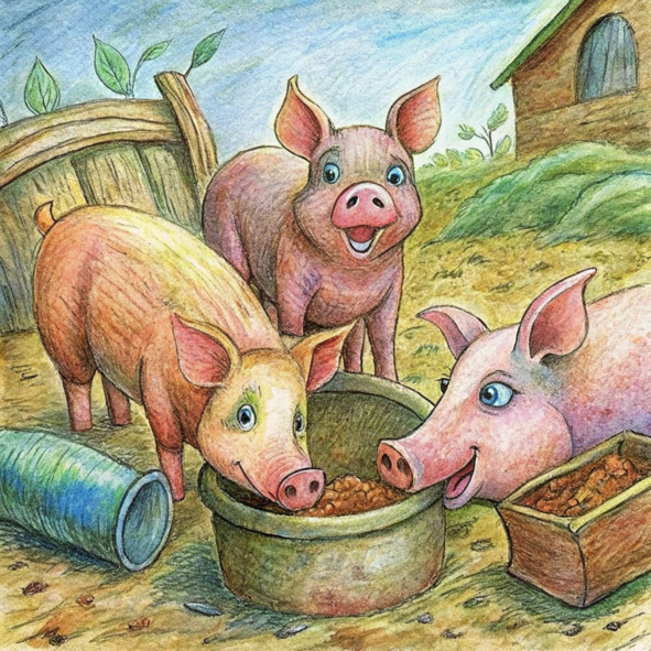 Быстрый взгляд внутрь сарая показал еще одну сбивающую с толку сцену: свиньи! Их там не должно было быть. Свиней обычно держали в хлеву за сараем, они наслаждались собственными кучами грязи и радостно хрюкали. Но вот они столпились вокруг гигантского ведра с надписью