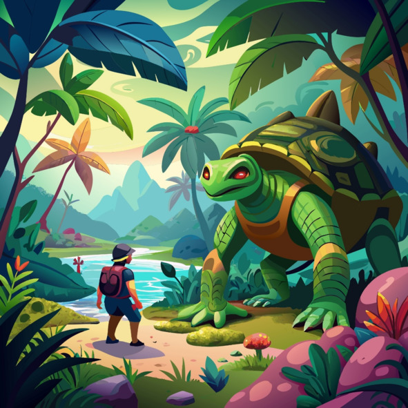 Пенни углубилась в джунгли, ее чувства трепетали от предвкушения, когда она наткнулась на поляну, залитую золотистым солнечным светом. И там, уютно устроившись среди корней древнего дерева, сидело самое необычное существо, которое Пенни когда – либо видела, – массивная черепаха с панцирем величиной с дом, ее морщинистая кожа, украшенная мхом и лишайником, походила на живой памятник самому времени.