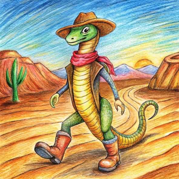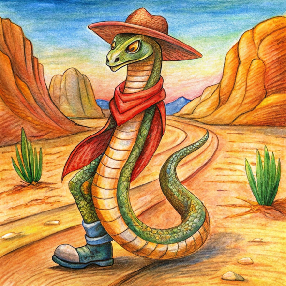 Ромина потянулась своим длинным, гибким телом, ощущая тепло пустыни на своей чешуе. Пришло время для небольшого приключения! Щелкнув языком и вильнув хвостом, она отправилась на бескрайние просторы пустыни, готовая исследовать и узнать, что может принести этот день. В конце концов, Дикий Запад таил в себе бесчисленное множество тайн, и Ромина, предприимчивая кобра, была готова раскрыть их все!