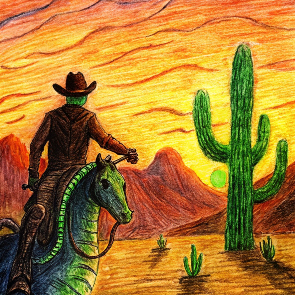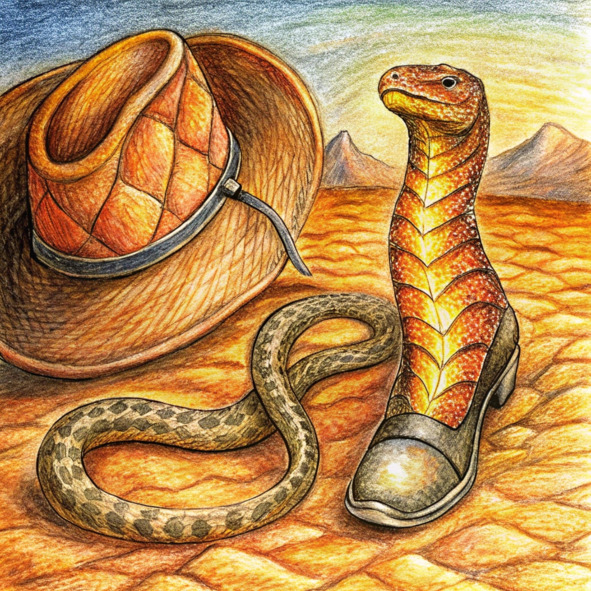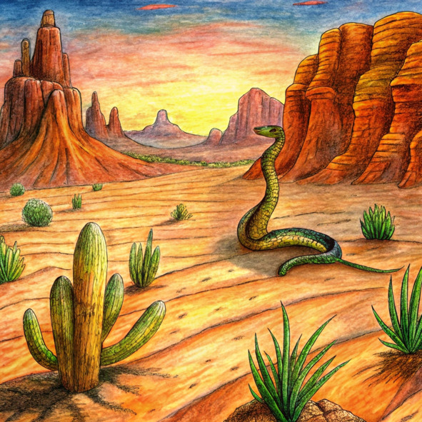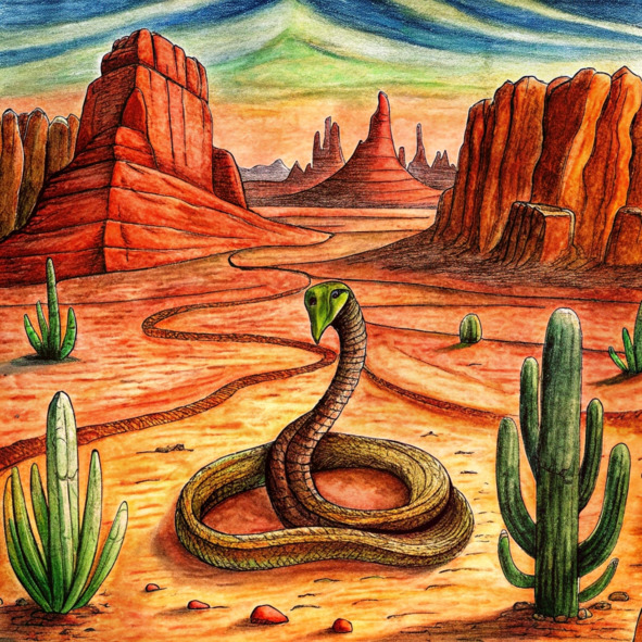 Солнце палило на пыльные равнины, заставляя песок мерцать, как тысячу крошечных зеркал. Кактусы стояли высокие и гордые, их колючки блестели, как иглы, в резком свете. Это был Дикий Запад, страна широких просторов и бесконечного синего неба. И в этой дикой стране, уютно устроившейся среди скал и колючих кустарников, жила совершенно особенная кобра по имени Ромина.