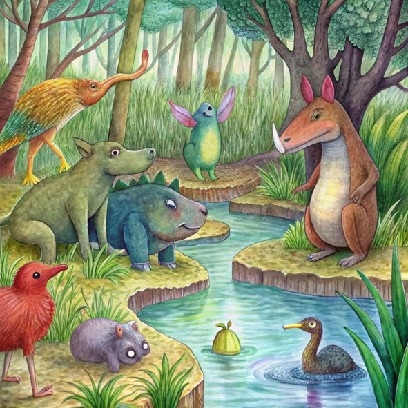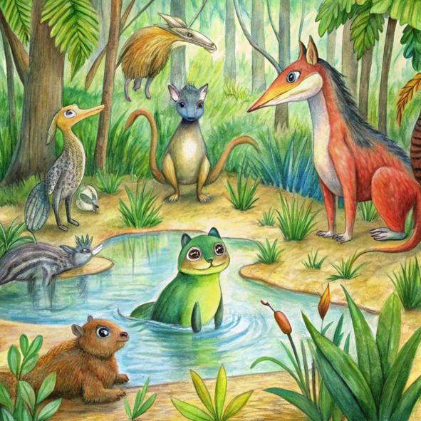 Но в основном болото было местом, где животные собирались вместе, чтобы поделиться новостями, сплетнями и посмеяться. Они собрались в прохладной тени гигантских водяных лилий, их зеленые листья были такими большими, что могли бы стать гигантским зонтиком! Там они сидели и разговаривали, их голоса сливались воедино, как волшебная болотная симфония.
