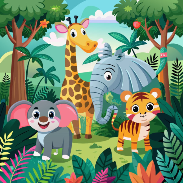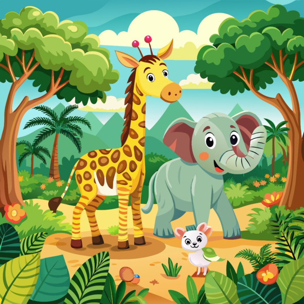 Каждое утро Хавьер встречал восход солнца радостным трубным звуком, эхом разносившимся по густой листве джунглей. Он жил среди высоких деревьев, их ветви переплетались, словно гигантский зеленый навес над головой. Но Хавьер был не одинок в этом ярком раю; он делил свой дом с двумя дорогими друзьями – зеброй по имени Зара и жирафом по имени Джордж.