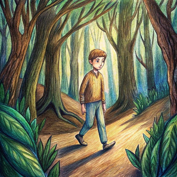 Он шел по тропе, грязной тропинке, протоптанной бесчисленными ногами, но сейчас он был там единственной живой душой. Его шаги отдавались мягким эхом, поглощаемые тихим, поросшим мхом лесом. Лес был темнее, чем он себе представлял, испещренный солнечными бликами, которые, казалось, танцевали и колыхались на ветру.