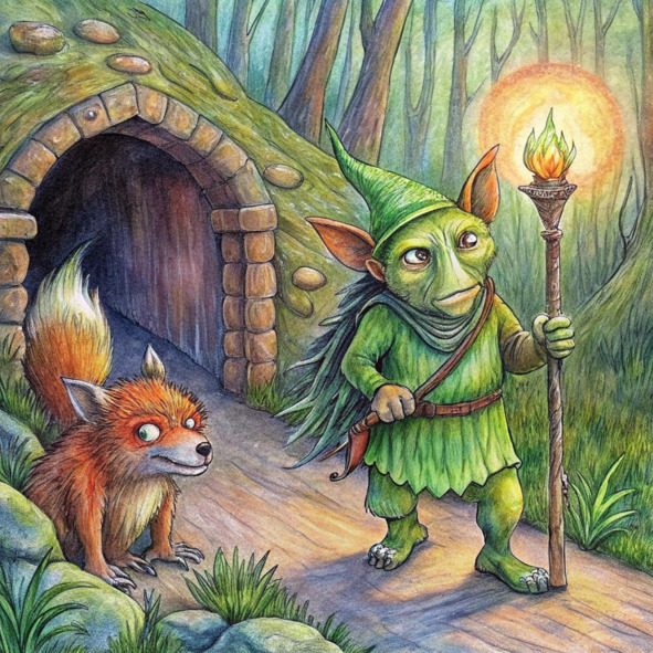– Они добрались до бурлящего ручья, перекинутого через великолепный мост, сооруженный из корявых, древних деревьев и лиан. Залитая лунным светом поляна пульсировала энергией, наполненная шепотом и гортанными криками, чарующими голосами Гоблинов!