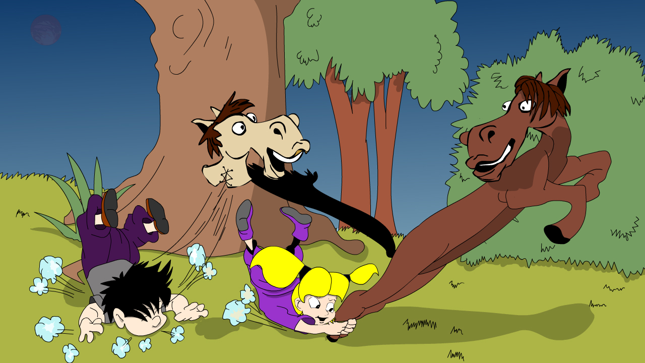 Тогда Атия и Ник решили в прыжке схватить её за ноги. Ник запнулся об корень ближайшего дерева и упал на землю. Его маска коня на секунду осталась висеть в воздухе. Лошадь задержалась на мгновенье, увидев знакомую морду собрата. Этого времени было достаточно Атии, чтобы схватить скакунью. Протащив Атию, по земле несколько метров, лошадка сдалась и дала себя вернуть в упряжку.
