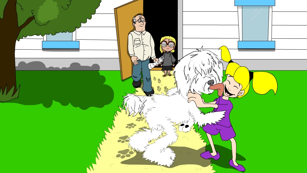Из дома на встречу вышел седой старик в больших очках. Он носил коричневый халат и белые тапочки. Посередине его головы не было волос. По бокам головы волосы были. Они были белые и закрученные. Рядом с ним была девочка в сером платье с узором в виде музыкальных нот внизу и одной нотой на том месте, где было расположено её сердце. Она носила большие круглые очки с толстой оправой сверху. Волосы её были ярко желтые и прямые. Длиной волосы почти доходили до плеч.