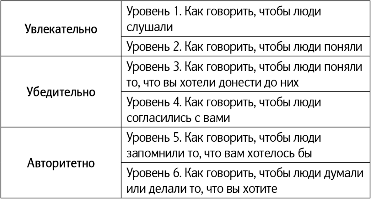 Моя цель – помочь вам говорить эффективно. Говорить так, чтобы люди слушали, – лишь первый шаг. Мне бы хотелось, чтобы вы научились говорить увлекательно, убедительно и авторитетно. Эти три принципа помогут вам овладеть шестью уровнями воздействия устной речи.