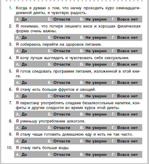 Пройдите этот тест, чтобы понять, готовы ли вы пройти курс семнадцатидневной диеты. Успешная и здоровая потеря лишнего веса требует правильного образа мышления. Выберите ответ, который, на ваш взгляд, лучше всего отражает ваше мнение.