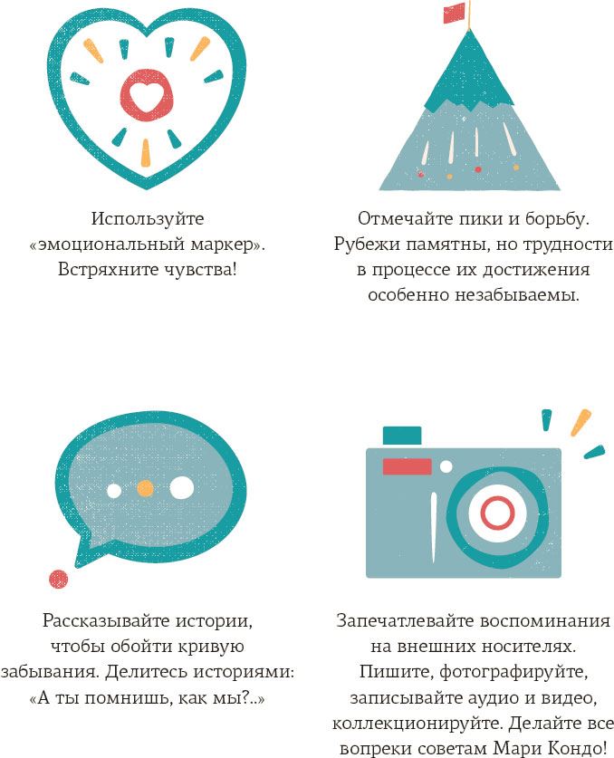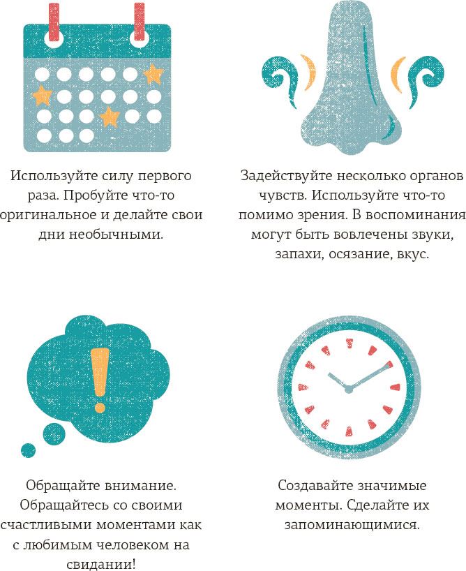 Все эти воспоминания – кусочки пазла, дающие нам представление о том, из чего состоят счастливые моменты, какие ингредиенты складываются в счастливые воспоминания и почему мы помним то, что помним. Каждый из этих ингредиентов мы рассмотрим в следующих главах.