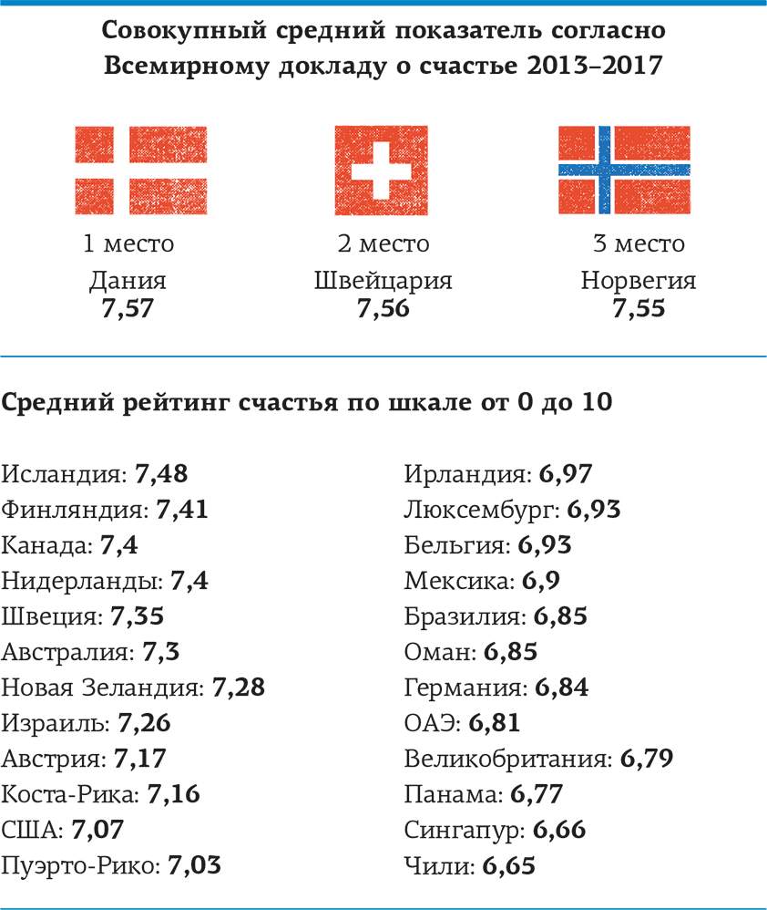 Дания действительно обычно занимает первые места в списках самых счастливых стран мира, но важно понимать, что эти рейтинги основаны на средних показателях. Так, в последнем Всемирном докладе о счастье датчане набрали в среднем 7,5 балла по шкале от 0 до 10. А это значит, что если в Датском королевстве одно работает исключительно хорошо, то другое, увы, прогнило. Скандинавские страны хорошо выглядят в рейтингах счастья – но ни датчане, ни норвежцы, ни шведы не обладают монополией на счастье. Жизнь в Дании убедила меня: в вопросах качества жизни у скандинавских стран есть чему поучиться, но уроки счастья можно получить и у многих других народов. Ключи счастья спрятаны по всему миру, и наша задача – собрать их.