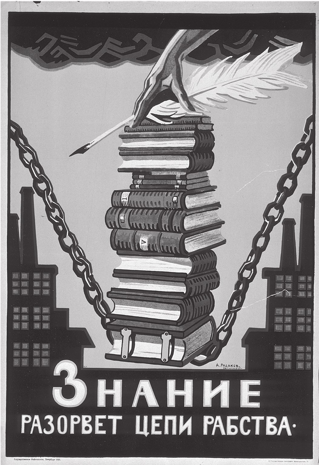 К гл 2. Алексей Радаков. «Знание разорвет цепи рабства», 1920 год. Рука с небес, опирающаяся на стопку книг, аллегорически изображает русско-советский, «интеллигентско-государственный» порыв к просвещению масс. Публикуется с любезного разрешения библиотеки и архивного отдела Гуверовского института (Стэнфордский университет).