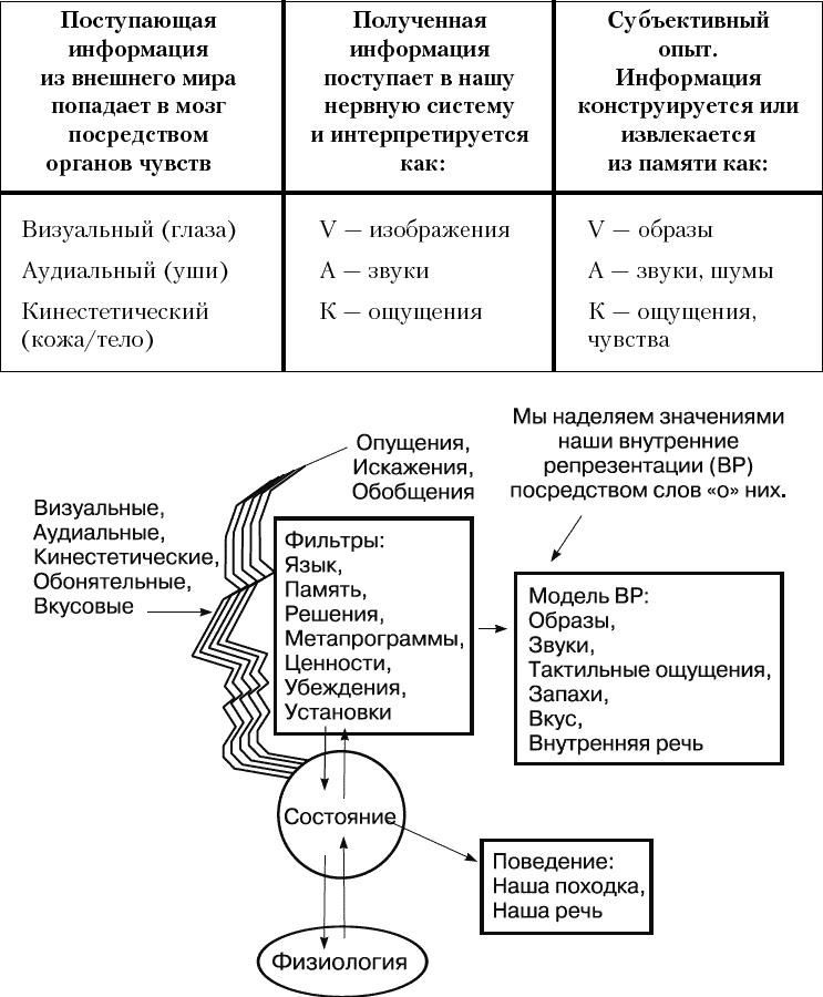 То, что происходит в нашем сознании при рассмотрении события, содержит в себе не событие, а только наше восприятие данного события. И наше восприятие принципиальным образом влияет на все, касающееся нас. Почему? Потому что когда мы воспринимаем внешнее событие, мы пытаемся наделить его смыслом. Пытаясь наделить смыслом данное событие, мы конструируем в сознании его внутренние репрезентации (ВР). Эти внутренние репрезентации включают в себя информацию, полученную посредством всех наших чувств. Иначе говоря, наши ВР имеют в своем составе визуальные, аудиальные, кинестетические, обонятельные, вкусовые и лингвистические компоненты.