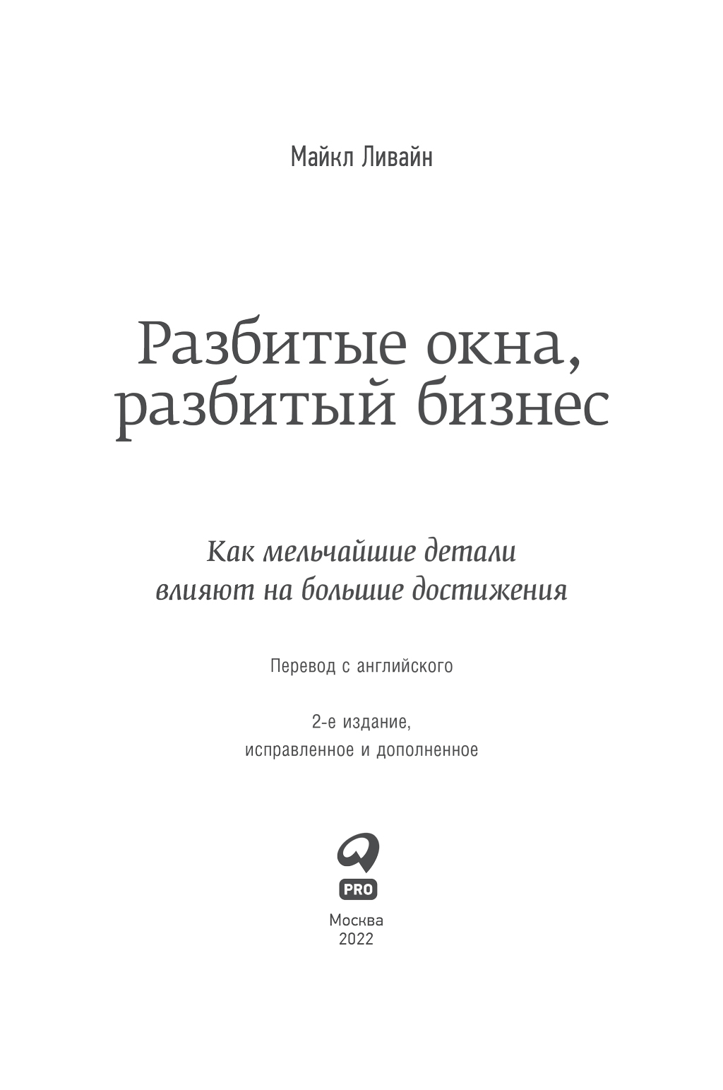 Настоящая книга посвящена разбитым окнам в бизнесе: как это применимо, как это происходит, почему на это не обращают внимания и какие роковые последствия могут наступить. Она задумана как поучительная история, азбука, атлас, манифест, а также как хвала тем компаниям, которые всегда вовремя чинят разбитые окна. В ней будут рассмотрены не только конкретные примеры разбитых окон, причины их возникновения и возможные последствия, но и обстановка, которая создает условия для появления разбитых окон и пребывания их разбитыми.