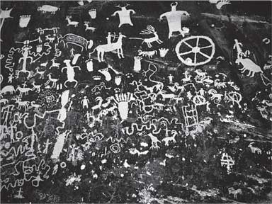 – Переводится как «Газетная скала». На небольшом участке этой скалы, что находится на границе штата Юта, обнаружено пять тысяч петроглифов – они просто выскоблены на черной поверхности. Согласно официальной версии, это символы клана, которые более тысячи лет подряд вырезали там юноши племени хопи. Это была часть обряда инициации. И надписи якобы означают: «Я здесь во славу моего племени и моих богов, как бывали тут и мои праотцы до меня». Однако, помимо традиционных для хопи изображений, таких как койоты и кукурузные початки, встречаются и весьма причудливые. Например, отпечатки ног с двумя или шестью пальцами, напоминающие скорее отпечатки ладоней. Ну разве не странно? Ведь если человек вознамерился потратить немалое время на то, чтобы высечь на камне изображение руки или ноги, то, думается мне, он знает наверняка, независимо от «примитивности» его культуры, сколько пальцев надо нацарапать.