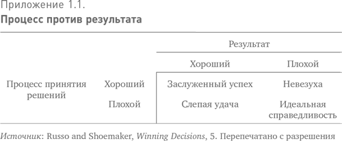 Джей Руссо и Пол Шумейкер проиллюстрировали концепцию «процесс против результата» в простой матрице два на два (см. приложение 1.1). Идея в том, что вследствие игры вероятностей хорошие решения иногда ведут к плохим результатам, а плохие решения иногда ведут к хорошим результатам – как в той истории о партии в блэкджек. Однако в долгосрочной перспективе именно процесс определяет результат. Вот почему казино – «дом» – всегда остается в выигрыше.