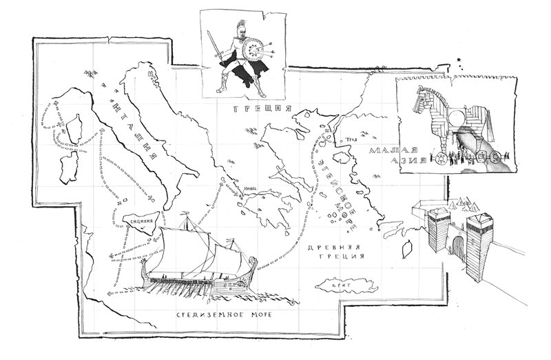 К окончанию школы я сделала карту, которая занимала полстены в моей комнате, – карту с маршрутом Одиссея, с десятилетним плаванием домой, которое он проделал после того, как греки завоевали Трою. Та хитроумная и чудовищная победа – по-моему, это было величайшее надувательство в истории! – долго не давала мне покоя. Когда греки оставили на равнине между городскими стенами и морем гигантского деревянного коня: мол, это вам, троянцы, наш прощальный подарок. А внутри этого коня притаилась целая толпа греческих воинов, вооружённых до зубов, чтобы ночью потихоньку прокрасться в город и натворить там всяких ужасов. У меня до сих пор хранится в комоде футболка с троянским конём – она мне стала чуть тесновата, но это моё сокровище, поэтому пусть лежит.