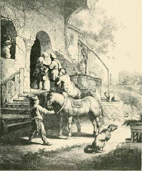 На фоне ветхого трактира, на вид древнего и слегка экзотического, тяжело раненному человеку помогают сойти с коня. На ступенях перед входом в трактир – кучка людей, каждый из которых занят, даже поглощен, своим делом. Их сближает и одновременно подчеркивает индивидуальность каждого лаконичность образов, условность черт, в основном – глаз и носа. Юный конюх стоит в характерной позе охранника, его определяющие черты – это перевязь с кинжалом на талии и полумесяц безбородого лица, на котором видны только точка правого глаза и пуговка носа, поскольку оно обращено к путнику, чьи черты искажены гримасой боли. Слуга, который помогает ему спешиться, как будто не ощущает веса его израненного тела. Только напряжение его пальцев, ушедших в складки одежды путника, говорит о прилагаемом усилии. Слуга заметил собаку и смотрит на нее, нахмурившись и сморщив широкий нос. Он – единственный из всех участников сцены, кто заметил животное. У входа в трактир глаза хозяина с костлявым и морщинистым носом подозрительно и озадаченно буравят самаритянина, чья безликость, подобная безликости Христа на картине «Трапеза в Эммаусе» из музея Жакмар-Андре в Париже – самая дразнящая деталь этого офорта. Темное пятно его щеки над левым плечом притягивает взгляд, вызывает желание войти в картину и посмотреть, как выглядит этот добрый человек. Юноша, опирающийся на подоконник в левом углу картины, мог бы что-то сообщить нам об этом, поскольку смотрит прямо на самаритянина, но его повернутое в профиль лицо непроницаемо; если на нем что-то и написано, то это скука молодого человека – путешественника или солдата, – который видел вещи более занятные, чем случайное проявление доброты. Жизнь его не сахар, и сломанный нос тому свидетельство.