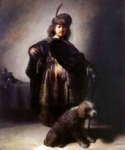 Этот или похожий на него пес встречался у Рембрандта и раньше. В 1631 году, когда Рембрандт в возрасте двадцати пяти лет покинул родной Лейден и переехал в Амстердам, чтобы стать главным художником в мастерской Хендрика ван Эйленбурга, торговца картинами и покровителя искусств, он написал свой портрет в образе турецкого паши, известный как «Автопортрет в восточном одеянии» (илл. 2). Это единственный автопортрет, на котором он написал себя в полный рост; исключением может считаться «Художник в мастерской», написанный на несколько лет раньше (хотя это скорее не автопортрет, а карикатура). Странный, с налетом театральности и чванства, он изображает художника на фоне голой стены, в тюрбане с эгреткой, очень похожем на тюрбан самаритянина, и переливающемся атласном халате цвета расплавленного золота, поверх которого через правое плечо царственно и небрежно накинута пурпурная тога – до нелепости величественное одеяние для такого молодого человека. Вид у него решительный, даже воинственный, он стоит в излюбленной позе князей и победоносных генералов – упершись правой рукой в бедро и отставив локоть.