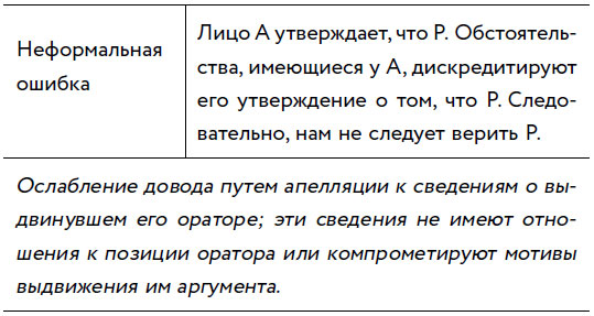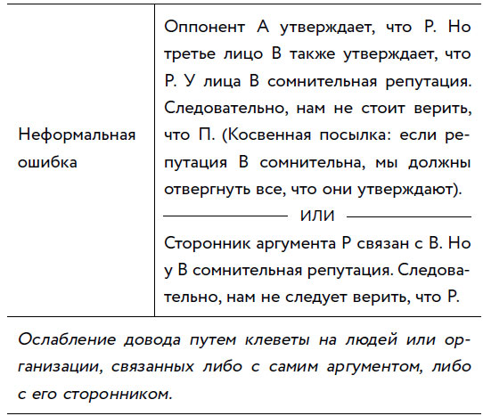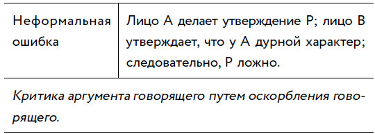 Неформальная ошибка – еще более хитрый случай. Это ошибка, при которой вывод не следует из посылок не из-за логической структуры аргумента, а из-за содержания посылок и заключения. Следовательно, мы не можем отвергнуть такой вывод лишь из-за формы аргумента; скорее, мы должны проанализировать его и увидеть, каковы на самом деле посылки и выводы. Неформальные ошибки сложнее диагностировать и опровергнуть, поскольку необходимо смотреть не только на содержание посылок и заключения, но и на то, как аргумент используется.