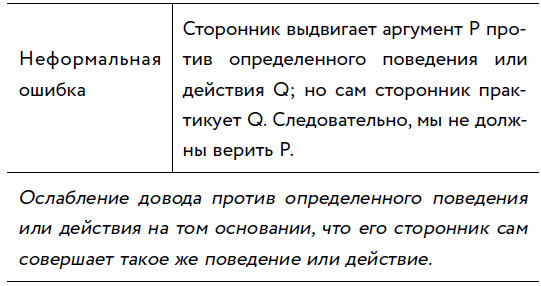 Как и другие виды ad hominem, этот аргумент не имеет отношения к спору: личность сторонника не влияет на истинность высказывания. Даже если сам сторонник практикует некое поведение, это не означает, что он ошибочно или даже неискренне его осуждает. То, что отец курит, не исключает его способности непредвзято судить о том, что курить вредно, и тем более не исключает истинности самого факта, что курить вредно.