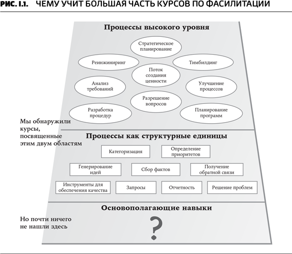 Все это – основополагающие навыки фасилитатора, помогающие группам достигать поразительных результатов. В начале 1993 года мы с другими сотрудниками Leadership Strategies заинтересовались, где можно научиться этим навыкам. Мы нашли много курсов, имеющих отношение к фасилитации процессов более высокого уровня, таких как стратегическое планирование и анализ требований. Также мы обнаружили курсы, на которых давались основы отдельных рабочих методов, таких как инструменты для определения качества работы и техники решения конкретных проблем. Чаще всего это были прекрасные учебные курсы. Однако их создатели не уделяли должного внимания базовым навыкам, которые помогли бы фасилитаторам преуспеть на своем поприще. На некоторых курсах речь шла о концепциях, связанных с групповой динамикой, однако зачастую там лишь описывался желаемый результат (к примеру, необходимость помочь группе прийти к консенсусу), но ничего не говорилось о том, как именно его достигнуть. Казалось, что всем этим учебным программам недостает информации об основополагающих навыках (рис. I.1).