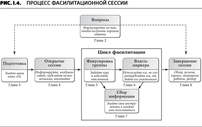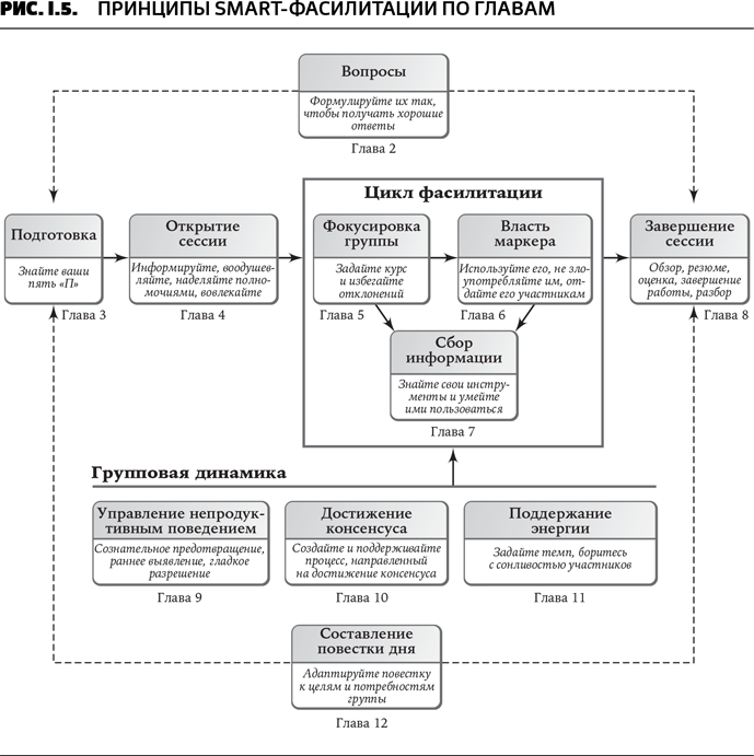 Поскольку эта диаграмма имеет много компонентов, я разобью ее на основные части. Каждая из 11 глав после главы 1, рассказывающей о роли фасилитатора, посвящена одному из этих принципов. Главы 2–8 описывают принципы, которые служат основой для обычной фасилитационной сессии (рис. I.4).