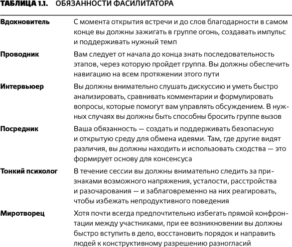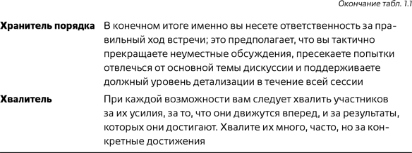 Вы как фасилитатор активно участвуете в планировании и проведении сессии. В этой роли вы стимулируете людей и бросаете им вызов. Как следует из определения фасилитатора-лидера, у вас имеется несколько обязанностей, описанных в табл. 1.1.