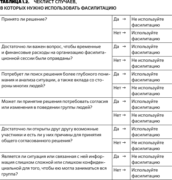 Когда фасилитация используется ненадлежащим образом, результат может быть обескураживающим. Однако при правильном подходе она позволяет выработать отличные решения, которые примет и будет готово реализовать большее число участников встречи. В табл. 1.2 приведены случаи, в которых следует и не следует применять фасилитацию.