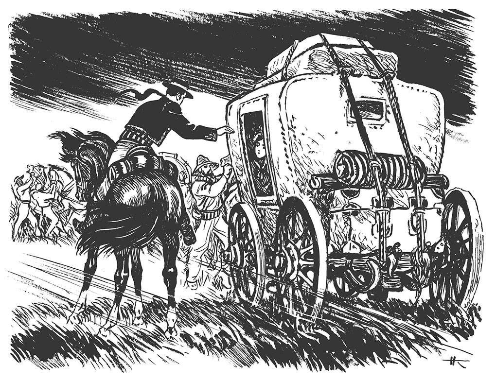 Незнакомец снял с седельной луки свернутую веревку и, прикрепив один конец к кольцу на седле, бросил другой на землю. Затем, изящным движением приподняв шляпу, он вежливо поклонился – почти в сторону кареты, – пришпорил лошадь и снова поскакал по прерии.