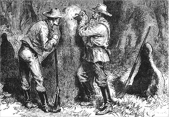 Пройдя шагов двадцать по лесу, старый охотник остановился перед одним из кипарисовых «колен», этих растительных причуд, которые сбивают с толку ботаников и до сих пор не объяснены учеными. По форме своей они напоминают окорок, торчащий тонкой частью вверх. Сходство настолько велико, что южане обвиняют дельцов-янки, будто те, завернув эту деревяшку в парусину, продают ее под видом настоящего мяса!