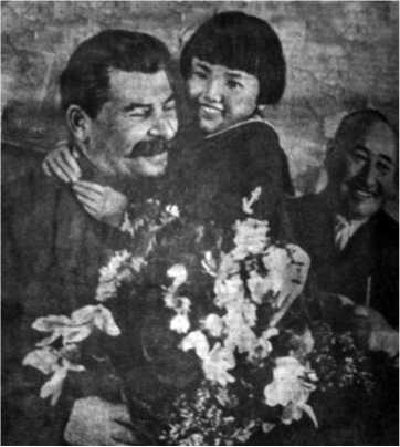 И.В. Сталин с Гелей Маркизовой. Справа секретарь Бурят-Монгольского обкома ВКП (б) тов. Ербанов. Снимок сделан в Кремле 27 января 1936 г.