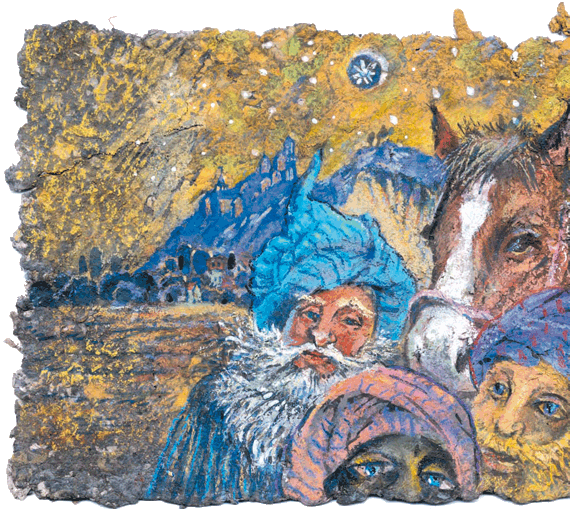 Вдруг пастухи услышали, что кто-то тихо подпевает им. Они подняли головы – может, это ночные птицы? Но это были не птицы. Тьма над их головами расступилась. С неба полился свет, ночью стало светлее, чем днем. В небе летали ангелы.