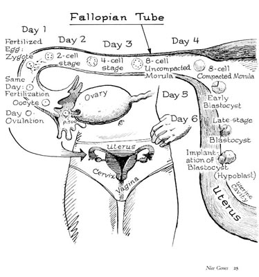 Figure 1.1 Tube Ride In the Fallopian tube, an egg has about twenty-four hours in which it may be fertilized. Once the sperm does so, the fragile combo, the blastocyst, multiplies its cells and must implant in the uterine wall to endure the 280-day pregnancy. Even if you try to summit Everest, this is the most dangerous journey you will ever take.