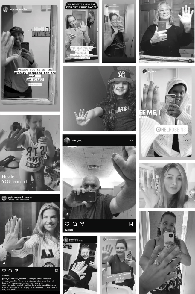 Не прошло и часа, как люди в разных уголках мира начали делать то же самое – давать себе пять и снимать это. Я была потрясена: мужчины, женщины, дети, бабушки, дедушки; перед работой, перед школой, просто спозаранку. Люди самого разного возраста и происхождения выкраивали минутку, чтобы поприветствовать себя в зеркале.
