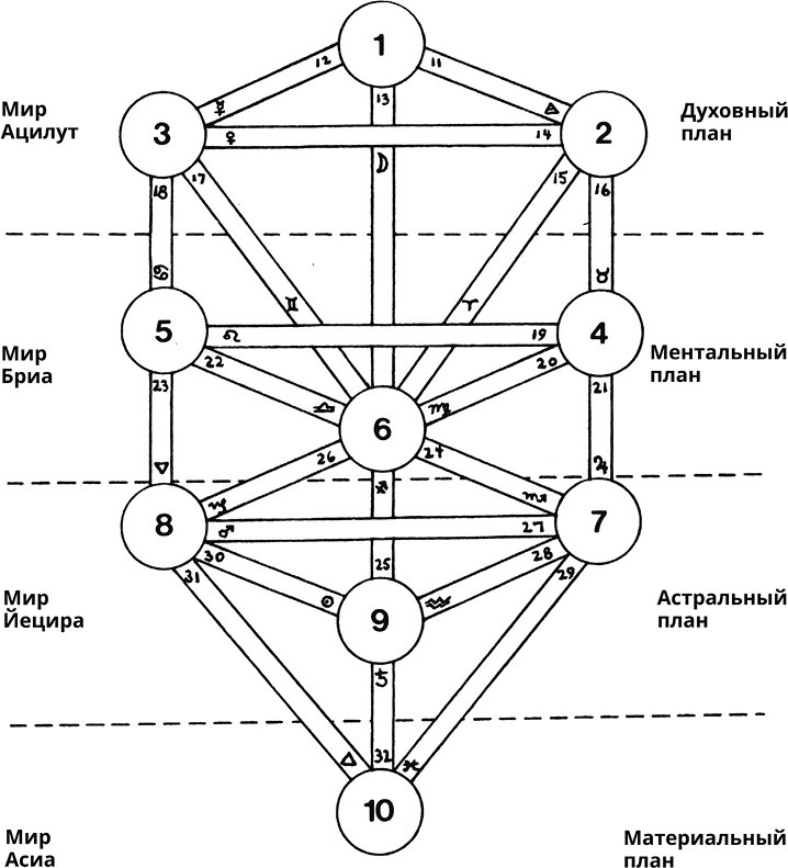 Здесь мы наблюдаем отличный пример, как каббалическая система прямо и непосредственно привносится в практическую работу, а результат отвечает лучшим ожиданиям. Определенная черта каждого из путей Древа Жизни – это специфическое действенное влияние, идущее в плюс к влияниям сфер на обоих концах пути. Это особое влияние на путь может быть установлено разными способами, каждый из которых открывает новый подход в нашем понимании. Например, каждый путь обозначен отдельной буквой еврейского алфавита с учетом ее формы и значимости, номера и даже определенных слов на идиш, в которых она содержится. Другой способ обозначения – соответствующее планетарное влияние, знак зодиака или, допустим, стихия. Речь может также пойти о том или ином Старшем Аркане Таро, опять-таки обладающем собственным характером, значимостью и набором ассоциаций.