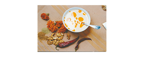 Separately prepare the seasoning: pound dry walnuts, dilute them in half glass of vinegar, add pounded dry coriander, utskho suneli (dry spices), saffron, garlic, and pepper and mix. Pass the mass through a sieve, pour it into the broth and boil on a low fire for approx. 20 min, stirring constantly. Let the broth cool, pour in 2 yolks beat up in a spoon of vinegar and stir to prevent the yolk from curdling. Then cut the turkey into pieces, put into a deep dish and pour over the satsivi sauce and some walnut oil.