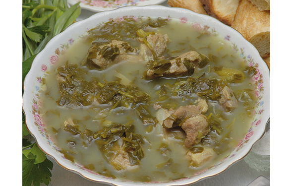 Take fat mutton or lamb meat with bones, cut it into small pieces and put into a saucepan. Pour in some water to cover the meat and cook on a slow fire, then add shredded onions and stew. Add shredded parsley, coriander, estragon, cook for approx. 5 min. and put in some fresh tkemali. When the tkemali is done, pour in some white wine and season with salt and pepper.