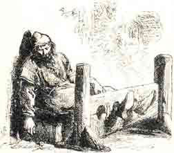 Преданный Каюс продолжал настаивать, чтобы король не оставался в эту непогоду под открытым небом. И ему, наконец, удалось уговорить короля войти в шалаш, стоявший вдали, в поле. Первым в шалаш вошел шут. Но сейчас же в ужасе отшатнулся, крикнув, что в шалаше какой-то призрак. Однако, оказалось, что этот призрак был просто сумасшедший нищий. Он тоже искал здесь убежища от непогоды, и своей безумной болтовней напугал шута. Этот нищий не то действительно был лишен рассудка, не то притворялся сумасшедшим, чтобы вернее вызвать сострадание у добрых людей. Такие несчастные в прежние времена часто ходили по деревням. Почему-то они называли себя то «бедным Томом», то «бедным Турлигудом» и повторяли: