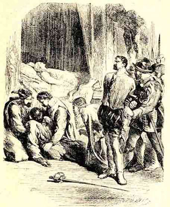 Однако, Кассио был только ранен, а Яго поторопился и убил своего же сторонника из боязни, как бы не обнаружилась истина. И в карманах погибшего нашли несколько писем. Из них было ясно видно, в чем дело, и ясно становилось, что в покушении на Кассио виновен Яго. И вот Кассио приказал отнести себя к Отелло, желая попросить у него прощения и узнать, за что к нему подослали убийц?