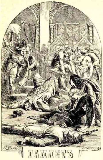 Королева видела тяжелое нравственное состояние Гамлета. Она и новый король старались всеми силами развлечь принца, но их усилия были тщетны. Гамлет всегда появлялся при дворе в глубоком трауре по отцу. Он не снял траура даже в день свадьбы матери, чтобы угодить ей, и отказался от всякого участия в торжествах этого дня, представлявшегося ему днём позора.