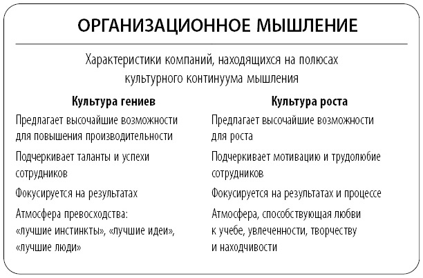 Организации с культурой роста сосредоточены на прогрессе и оказывают персоналу необходимую поддержку. Вместо «возможности показать свои способности» они предлагают возможности роста. Прогресс и успех действительно очень важны, в конечном счете это и есть главное – но интересы людей важны не меньше. Организации с культурой роста считают, что для достижения успеха необходимы способности, талант или интеллектуальная мощь, но важны и другие характеристики – мотивация, креативность, умение решать проблемы и готовность к саморазвитию.
