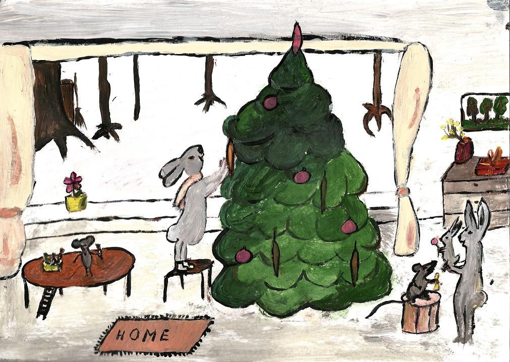 Дед Мороз вошёл в гостиную. Посреди комнаты стояла высокая нарядная ель. Вокруг суетились зайцы, пытаясь стянуть конфеты в виде морковки, специально подвешенные повыше.