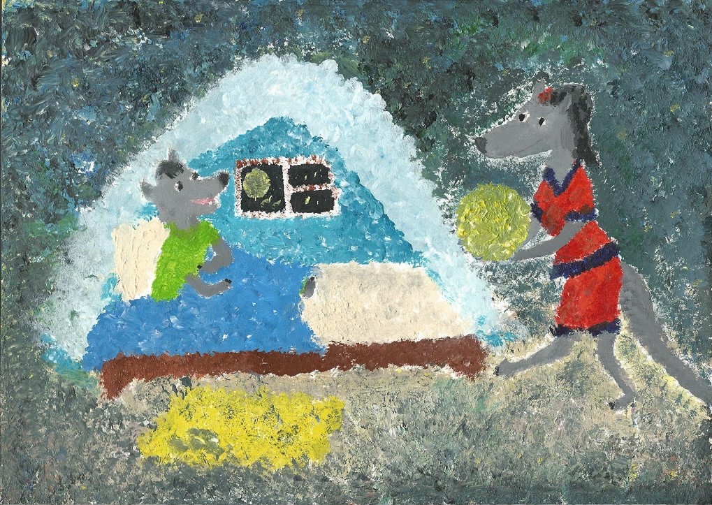 – А когда уже мы будем играть в мяч?– захныкал волчонок, еле шевеля лапами от усталости. Конечно же вчера он лёг спать очень поздно и у него совсем не осталось сил для таких нагрузок.