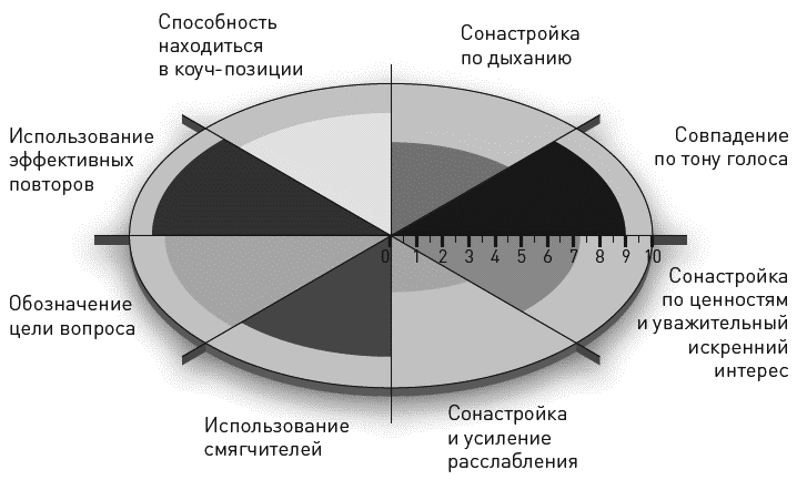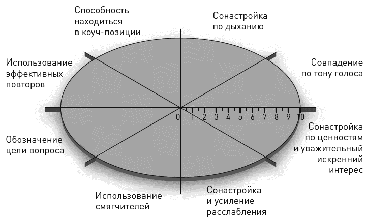 Поскольку взаимопонимание строится на разных уровнях, полезным упражнением будет построить колесо взаимопонимания (рис. 1.1). Это даст вам возможность рассмотреть вашу удовлетворенность своими навыками в сонастройке с разными людьми. Просто обратите внимание на те области, где вам легко взаимодействовать с людьми, а также на те, где вам еще трудно замечать их привычки и неудобно «танцевать их танец».