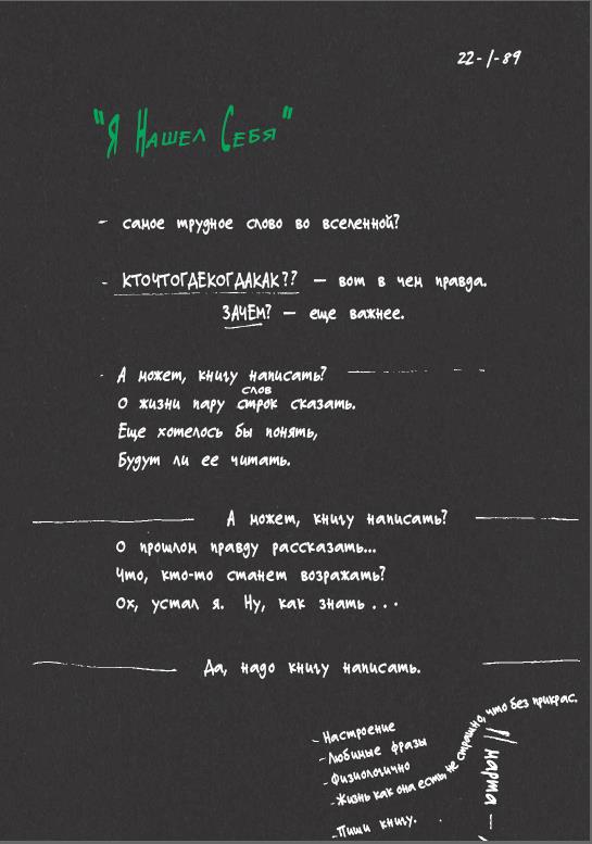 Это не традиционные мемуары. Да, я рассказываю о прошлом, но безо всякой ностальгии, сантиментов и отстранения, чего обычно ждут от мемуаров. И советов в этой книге нет. Я люблю проповедников, но не намерен читать проповеди и учить, как поступать.